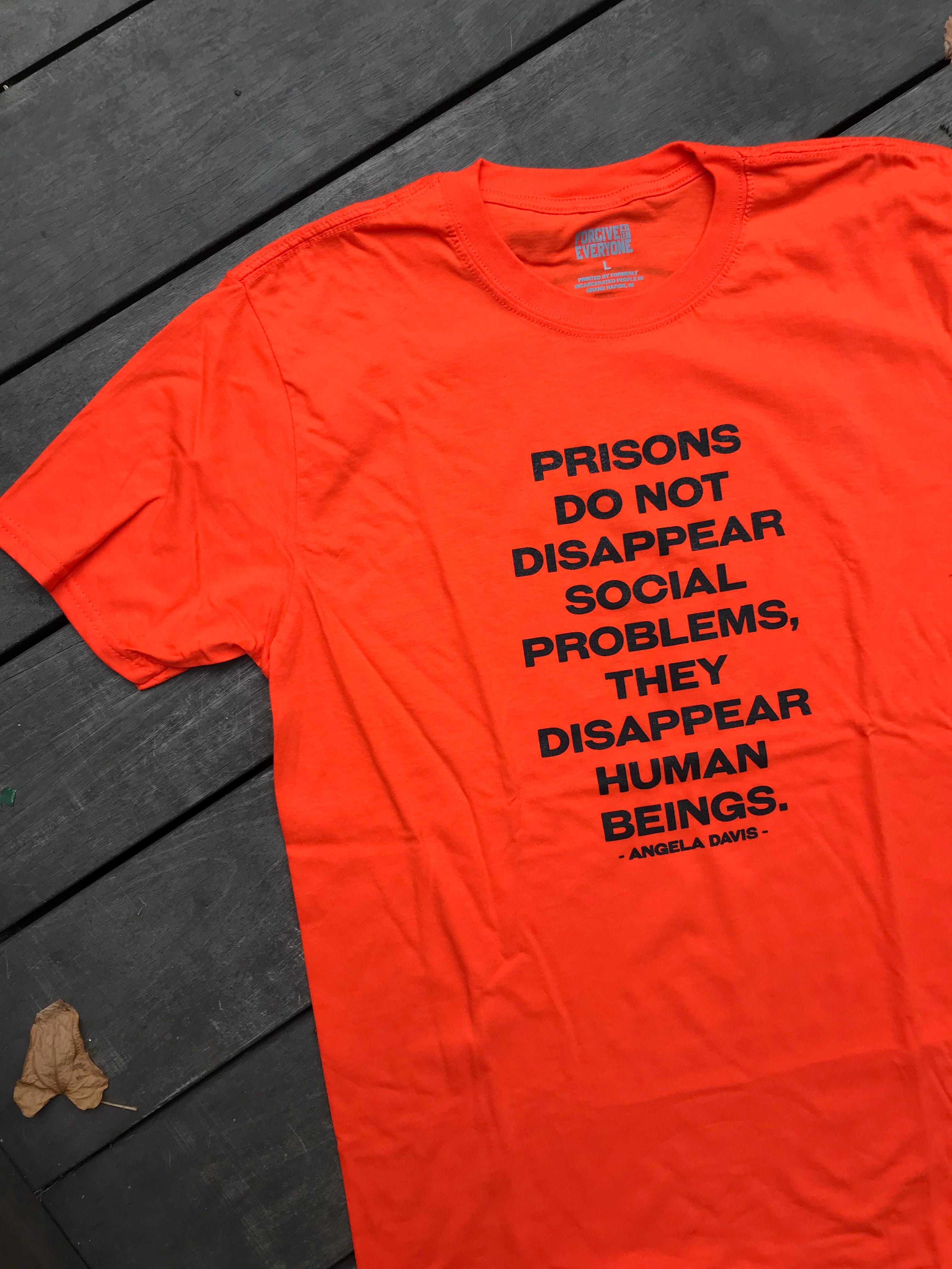 While the state has undoubtedly utilized the orange prison jumpsuit to bolster its power to the detriment of those incarcerated, there are complications in the state’s ability to determine the orange jumpsuit’s meanings. The aforementioned researcher Elspeth Van Veeran specifically refers to activist interventions within Guantanamo Bay Detention Camp and within the public sphere -- like a shirt-tearing protest led by Ahmed Errachidi inside Guantanamo and a public protest staged by Terry Hicks in which he wore an orange jumpsuit and locked himself in a cage on Broadway in New York City on behalf of his son -- that utilize the orange jumpsuit for protest.8 These are not the only times that the orange jumpsuit was used for civil disobedience inside Guantanamo; Mansoor Adayfi has indicated that “[a]ll we had in our cells were our orange uniforms, thin plastic ISO mats, flip-flops, and some of us had one towel,”9 and so it has functioned as a recurring tool for the men incarcerated there. Sherill Roland, the artist behind The Jumpsuit Project, brings the orange jumpsuit into public space as a method of creating spaces for conversation where audiences can challenge their presuppositions about mass incarceration. Jacques Agbobly similarly utilized clothing to comment on carceral presuppositions in their graduate collection at Parsons, the New School. While a range of themes and cultural codes lace their work, one stands out in our minds: they incorporated orange heavily in their collection both to “subvert the narrative around the color orange and incarceration” particularly as it applies to the dress practices of Black men. Our friends at For Everyone Collective -- an abolitionist screen printing collective -- sell one shirt, the Free Angela Tee, in the notorious orange color. With the words “‘Prisons Do Not Disappear Social Problems, They Disappear Human Beings.’ - Angela Davis” written across the front, this usage of orange acts as a tactic to force viewers in public spaces to look at the abolitionist idea. And, as previously mentioned, film and television like Orange is the New Black has used the orange prison jumpsuit as a tool in a quest to complicate cultural understandings of prison. As does woman prisons activist Mary Enoch Elizabeth Baxter whose lyrically focused music video speaks on the traumas of having to give birth behind bars while wearing an orange uniform, wrist and ankle shackles.